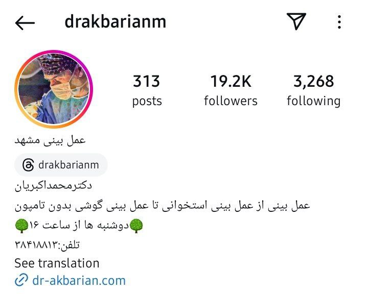 دکتر محمد اکبریانمتخصص گوش و حلق و بینی با بیش از ۱۰ سال سابقه در جراحی بینی، استفاده از متدهای روز دنیااحمدآباد، عارف ۳، پلاک ۲۴، ساختمان خورشید، تلفن: ۰۵۱۳۸۴۱۸۸۱۳، وب‌سایت: dr-akbarian.com